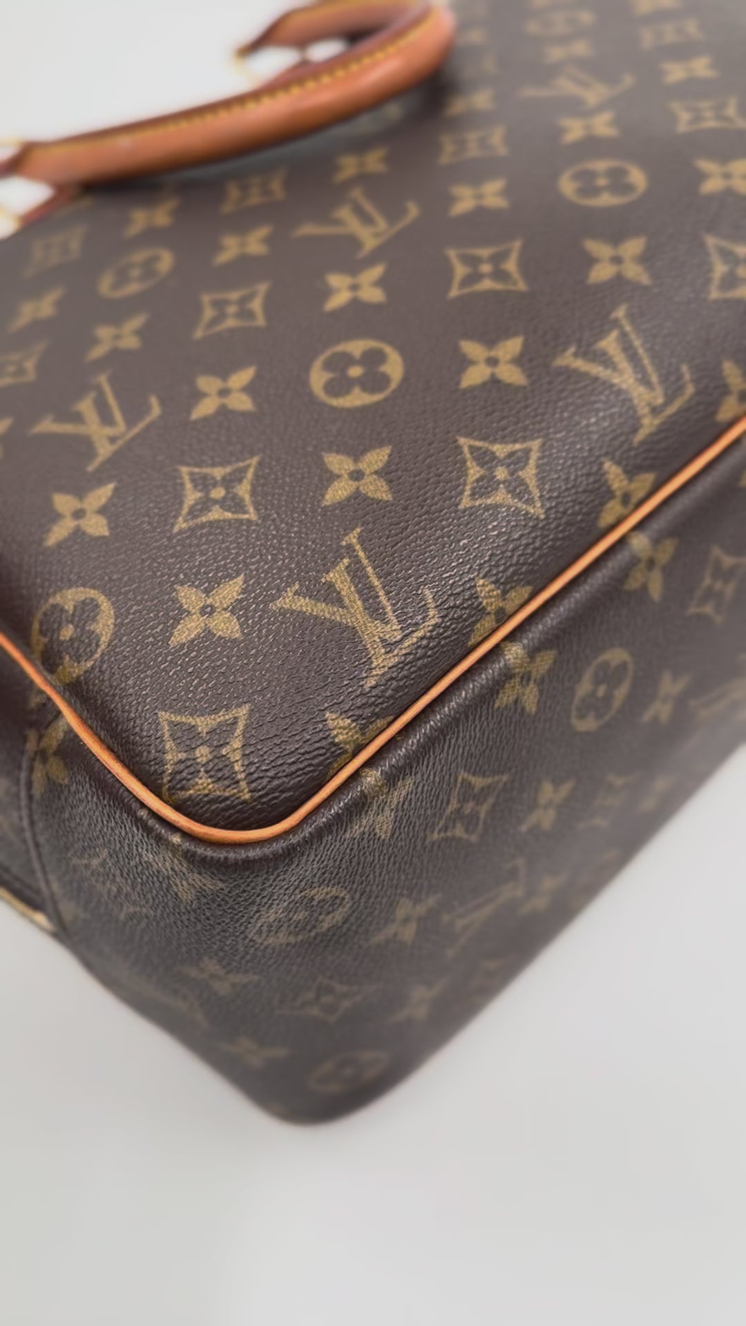 Deze pre-loved Louis Vuitton Deauville in monogram canvas heeft goudkleurige hardware. De tas is in goede vintage conditie met algemene gebruikerssporen. Afmetingen 34x12x25 cm. Dustbag aanwezig.